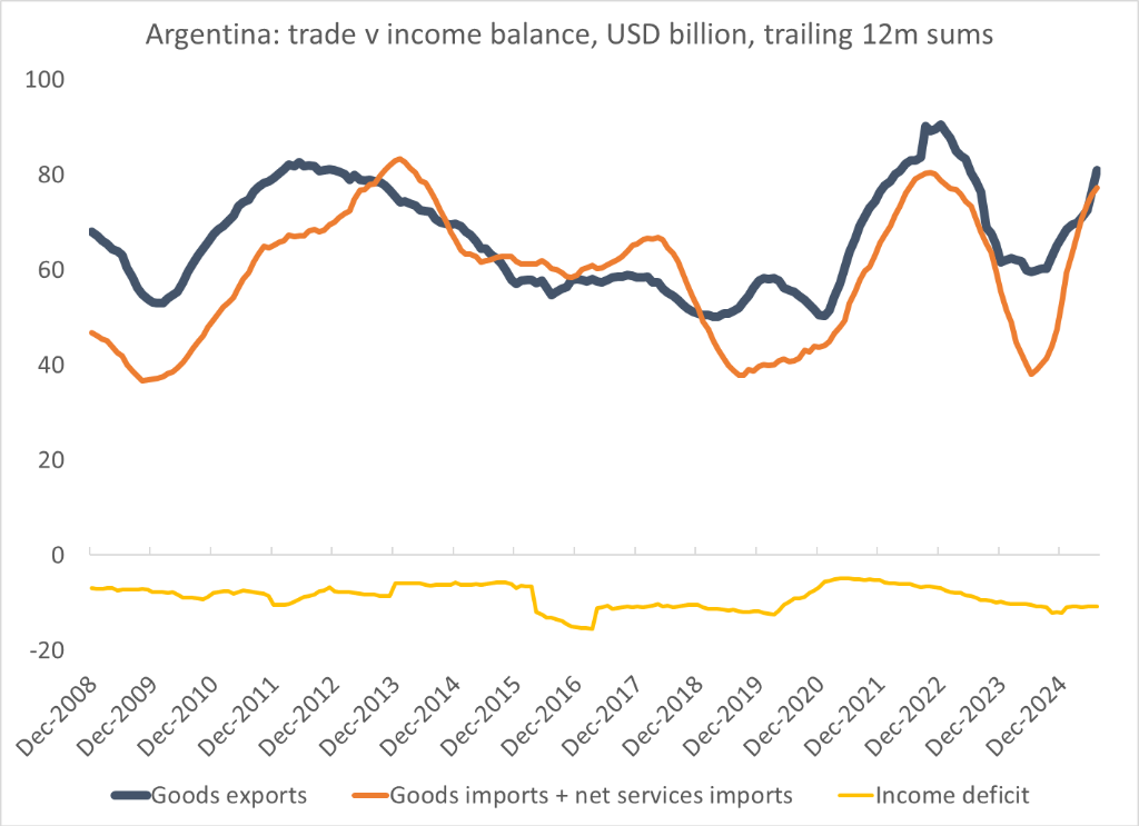 分析认为,阿根廷净投资收入常年为负值(黄线),政府必须维持大规模的贸易顺差(蓝线远高于橙线),才能填上这个洞,否则外汇储备就会被耗尽,引发危机。