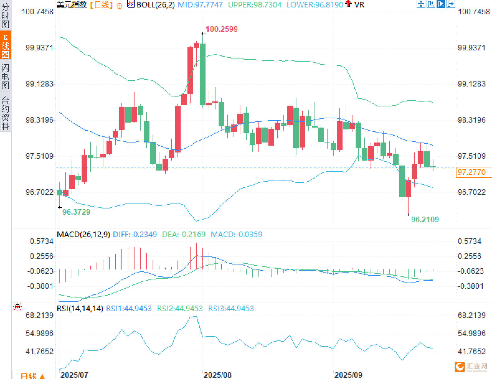 日线图显示,当前布林中轨97.7747、上轨98.7304、下轨96.8190。价格位于中轨下方、靠近中下轨区间,表明短线仍处弱势盘整并带有布林带挤压的收敛特征;若不能有效收复中轨,倾向在中轨—下轨间反复回测。蜡烛图上,近期曾出现下影线极长的探底(低点96.2109),随后反弹至97上方但受压于中轨,显示下方逢低承接存在,但上方动态阻力抬头。