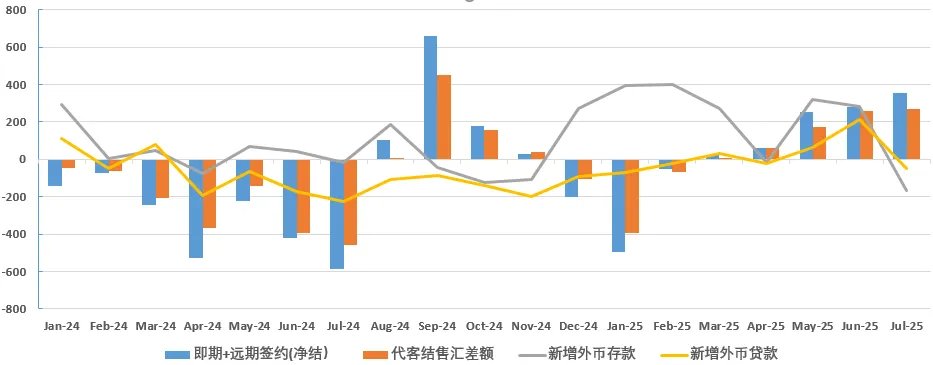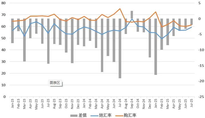 美联储9月重启降息,预计到明年底降息6次共150BP,终端利率跌至3.0%附近。中美利差从最高时近4%,届时仅剩1.5%。购汇率显示,企业对美元需求下降。