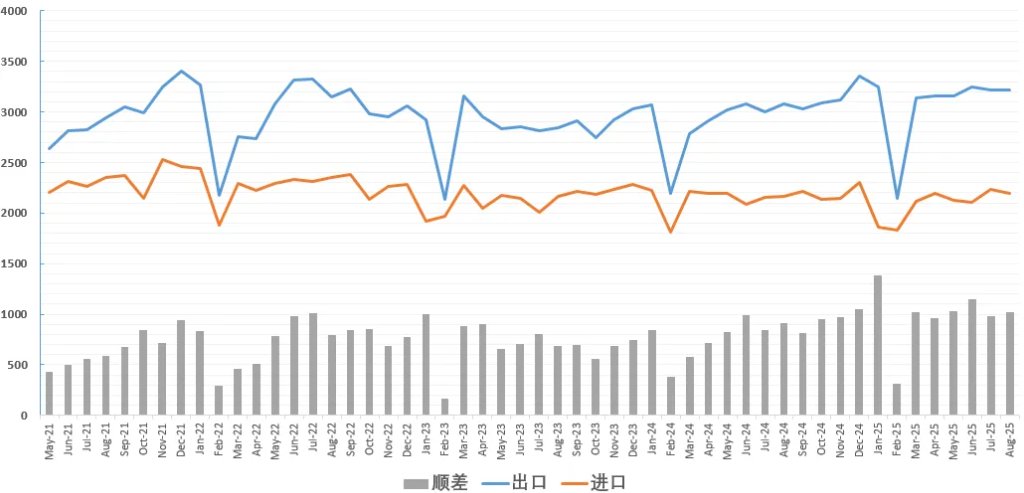 海关总署数据,前1-8个月,货贸顺差共7871亿美元,月均顺差近1000亿,超去年的6095亿,是21年的3576亿两倍多(彼时巨量结汇一度将人民币推至6.3关口)。