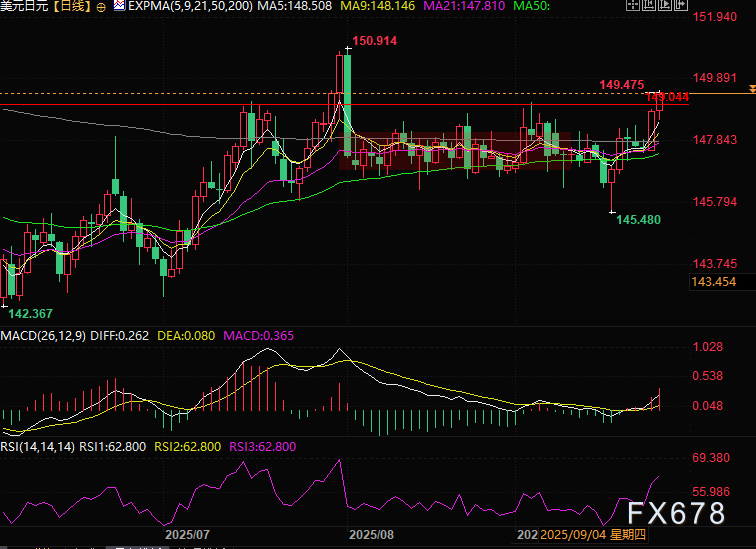 周四(9月25日)纽约交易时段。受美国二季度消费者支出年化增加值超预期0.9%以及二季度GDP年化高于预期0.5%影响,美元兑日元延续周三涨势,续涨60个点涨幅0.36%,目前交投于149.43。值得注意的是,周三受到鲍威尔、旧金山联储主席戴利对降息路径秉持审慎态度影响,美元兑日元涨0.85%。近期日元一直在贬值,并且技术图形上已经要走出贬值趋势了,要知道之前受到日本央行维持利率不变以及小泉进次郎对维持日本货币政策正常化的支持,日元本应对美元表现强势。
