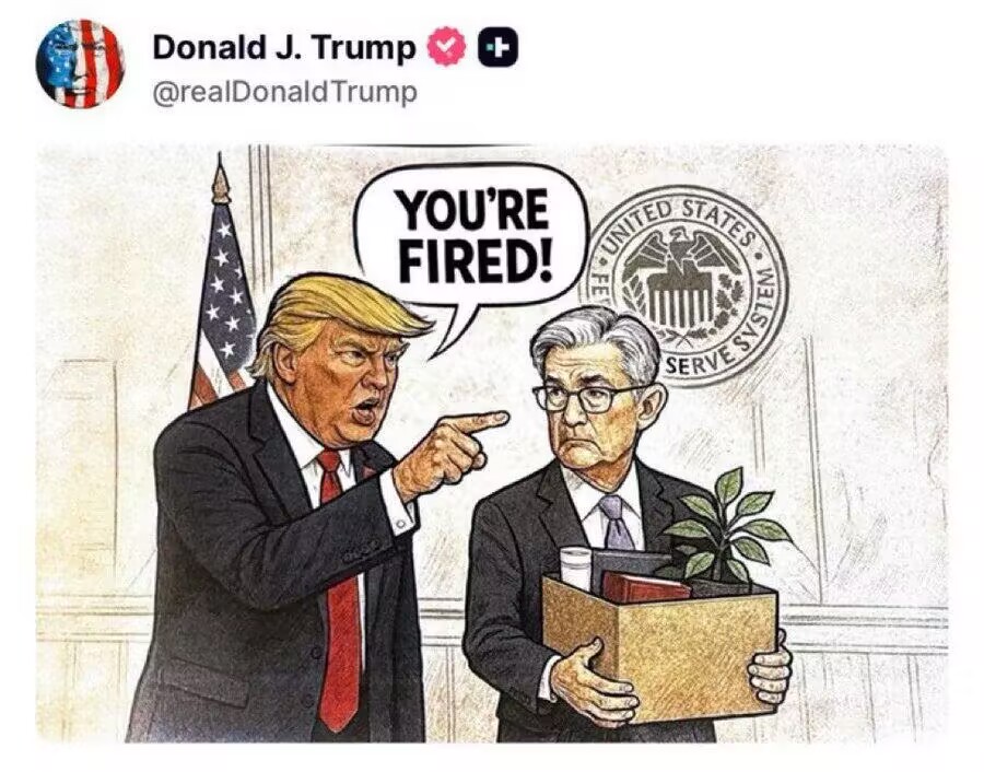 特朗普周末在社交平台发布AI生成的梗图,画面显示他用手指着鲍威尔,喊出标志性的“你被解雇了”,背景是美联储的官方印章。本周稍早,鲍威尔在一场讲话中重申美联储独立性,强调决策不考虑政治因素,被市场解读为对特朗普施压的直接回应。