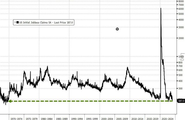 周四,截至1月13日当周的美国首次申请失业救济人数骤降至18.7万人,低于预期的20.7万,为2022年9月以来的最低水平,也是自1969年5月以来的第二低水平。