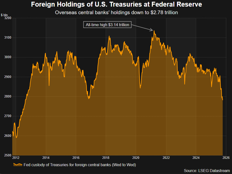 值得注意的是,过去一年半上述纽约联储托管的峰值2.95万亿美元,出现在今年3-4月——恰逢美国总统特朗普“解放日”关税混乱引发市场剧烈波动之前。根据这一即时指标,外国央行似乎从那时起对美国国债的热情已经降温。