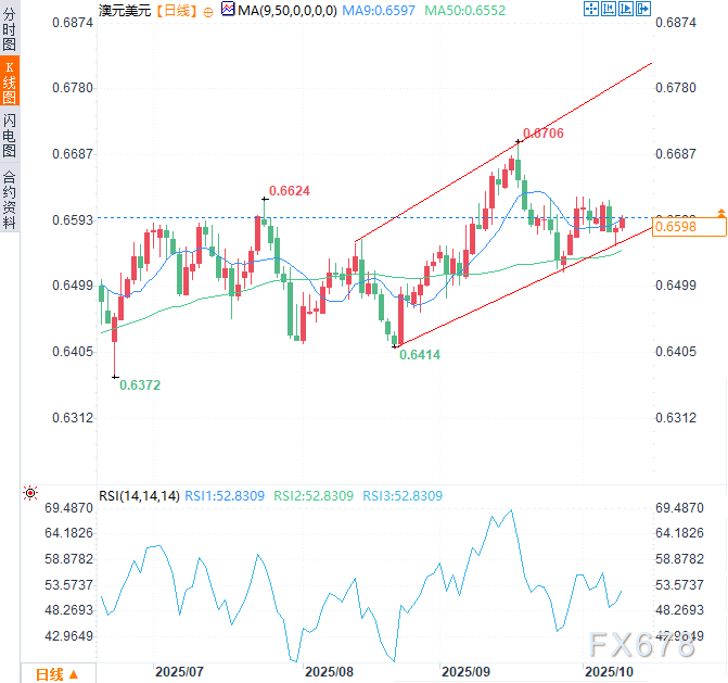 下行方面,近期支撑位于50日指数移动平均线0.6552及上升通道下轨0.6560构成的关键支撑带。若跌破该重要支撑区域,市场情绪可能转向看空,汇价或将下探8月21日创下的四个月低点0.6414附近。