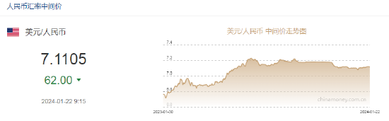 1月22日,人民币中间价报7.1105,上调62点,上一交易日中间价报7.1167。