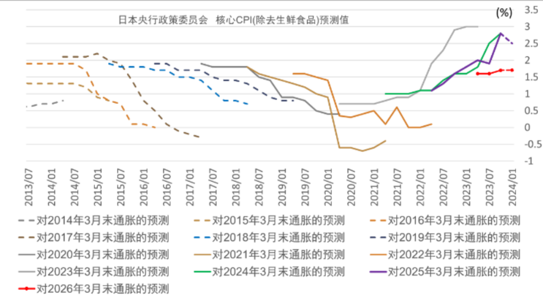 资料来源:日本央行,中金公司研究部图表6:日本央行货币政策委员会对日本核心CPI(除去生鲜食品)同比的预测