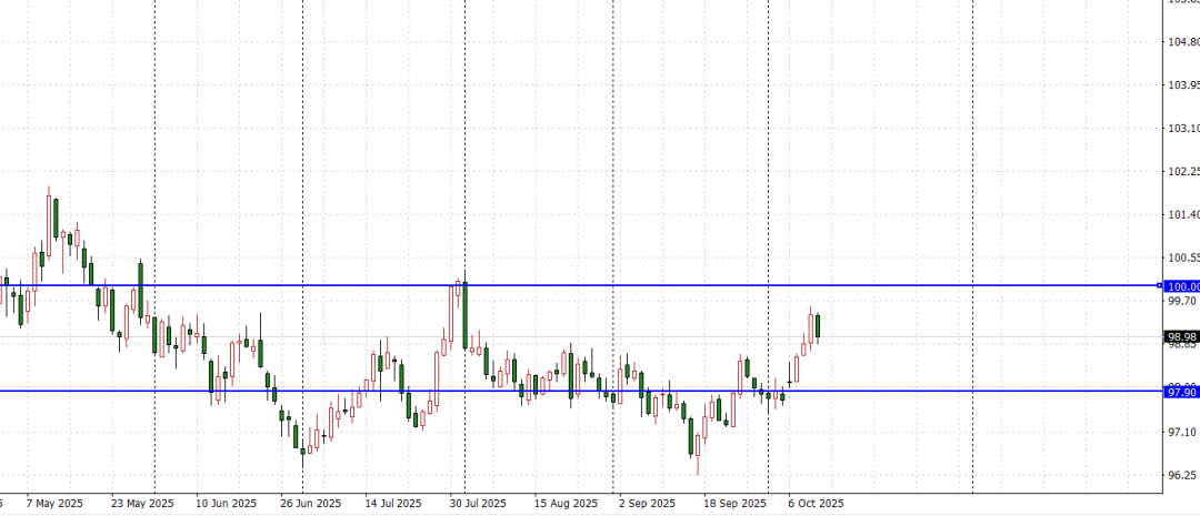 综合而言,美元指数本轮回升的主逻辑并非单一“恐慌买盘”,而是“风险偏好与避险需求”罕见同框的流动性叙事,即权益市场与美元同步走强,反映美联储货币宽松预期与经济增长不确定性并存的复杂混合体。与此同时,地缘政治的尾部风险仍在,中东局势阶段性缓和后仍存反复,不确定性并未出清;欧洲与日本的政治变动亦在延长“防御仓位”的窗口期。尽管9月美联储纪要显示“多数官员倾向年内再次降息”,但也有成员警示不要过快,理由是通胀黏性尚未彻底消退。纪要同步指出劳动力市场风险上升,就业增长温和,意味着政策空间打开但节奏谨慎。纽约联储主席的鸽派表述与纪要中多数官员支持年内进一步降息但警惕通胀顽固的基调,巩固了“宽松方向不变但节奏观望”的市场共识。但这种预期配合收益率走软、美元偏强、风险资产未退潮的少见组合,令美元指数在全资产普涨中保持韧性,受益于美元避险属性,以及流动性交易的核心一环。当前,情绪基调显示美联储降息表述使美元的多头市场情绪中带着克制;停摆造成的数据空窗,则让消息驱动权重放大,情绪弹性高度上升。价格维度层面,如若98.80价格修复区未有效突破,则将支撑美元指数在初步修正后延续上行。上方首先关注前期峰值高点100美元关口所对应的即时阻力区;若有效突破,则将有望强化市场买方看涨信心并进一步攀升至100.50一线目标。下方97.90转化为静态支撑,若失守,则需紧惕市场抛售情绪升温,从而导致价格面临进一步回落测试97.20目标区域的风险加剧。