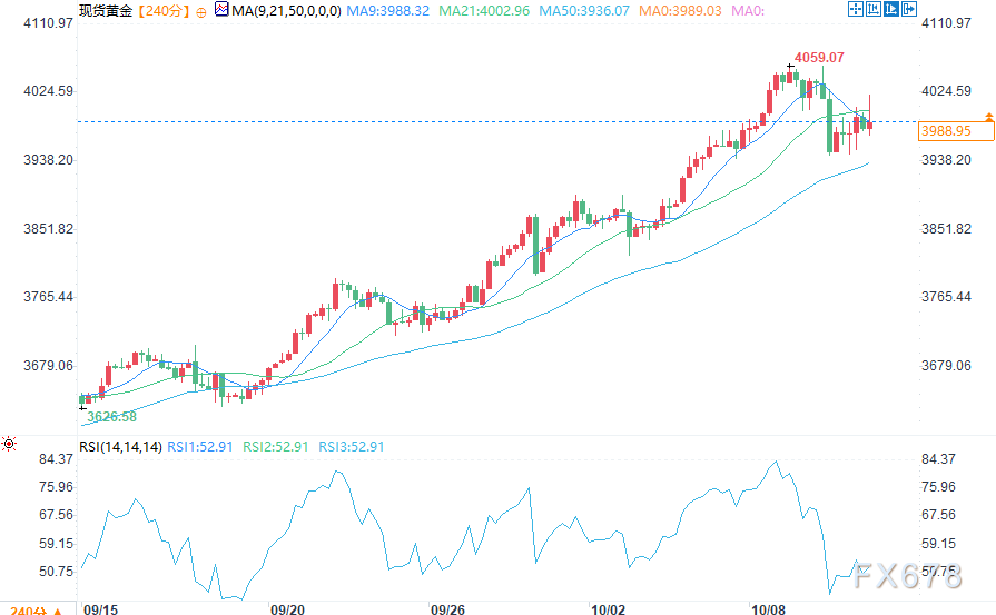 周五(10月10日),现货黄金走势企稳,在3985美元附近徘徊,多头难以将涨幅扩大至4000美元这一心理关口之上。周三金价曾试探4059美元的历史高点,次日大幅回落。
