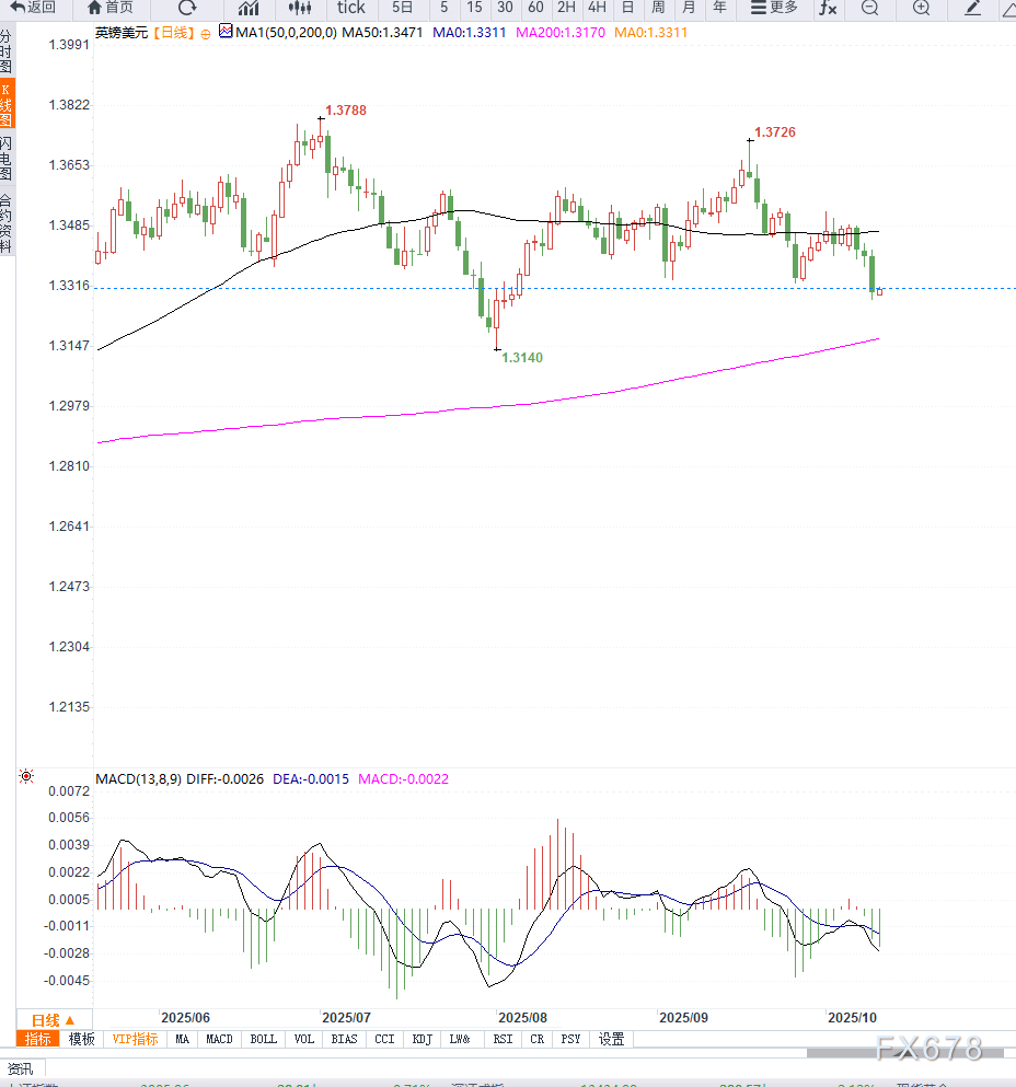 从日线图来看,GBP/USD在连续三日下跌后在1.3300附近获得支撑并小幅反弹。短期均线系统呈现多头趋平状态,显示上行动能暂缓但仍存在潜力。