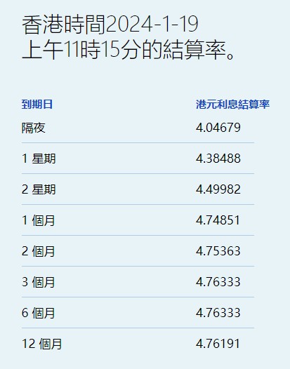 1月19日,港元拆息变动不大,但普遍回升,其中,隔夜息微升1基点至4.04679%,与楼按相关的一个月拆息结束七连跌,报4.74851%。不过一周钱连跌4天,今报4.38488%。