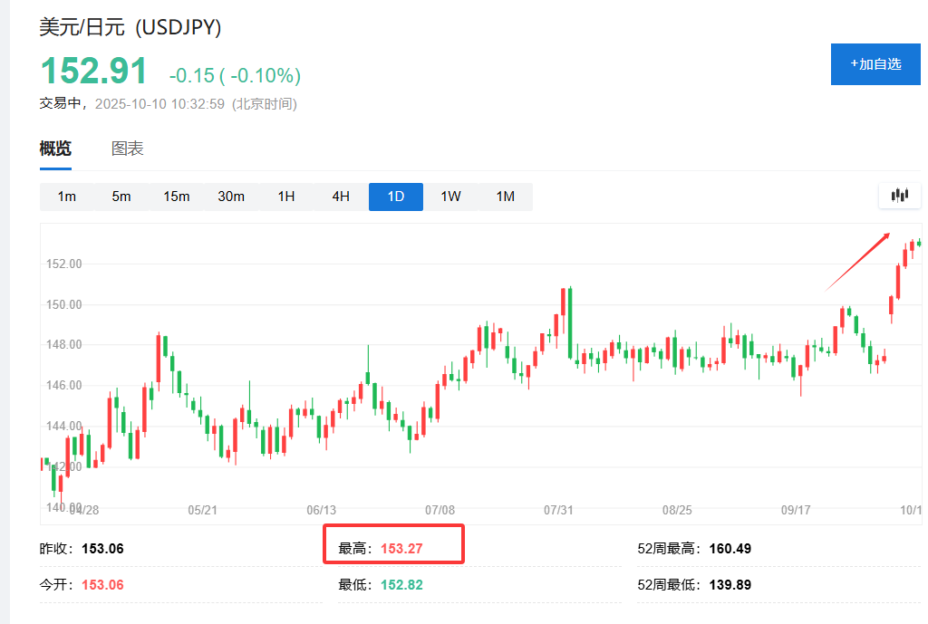 10月10日,日元兑美元汇率在亚洲早盘时段徘徊在153附近,维持在自今年2月中旬以来的最低水平。本周以来,日元累计跌幅已接近4%,有望创下去年10月初以来的最大单周跌幅。