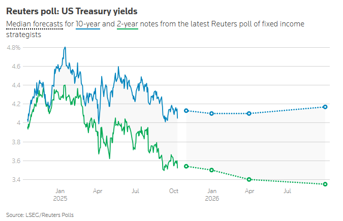 如果实现,这将意味着收益率曲线逐渐变陡,10年期和2年期收益率之间的利差将从目前的约50个基点上升到2025年底的60个基点,一年后将达到82个基点,为2022年1月以来的最阔水平。