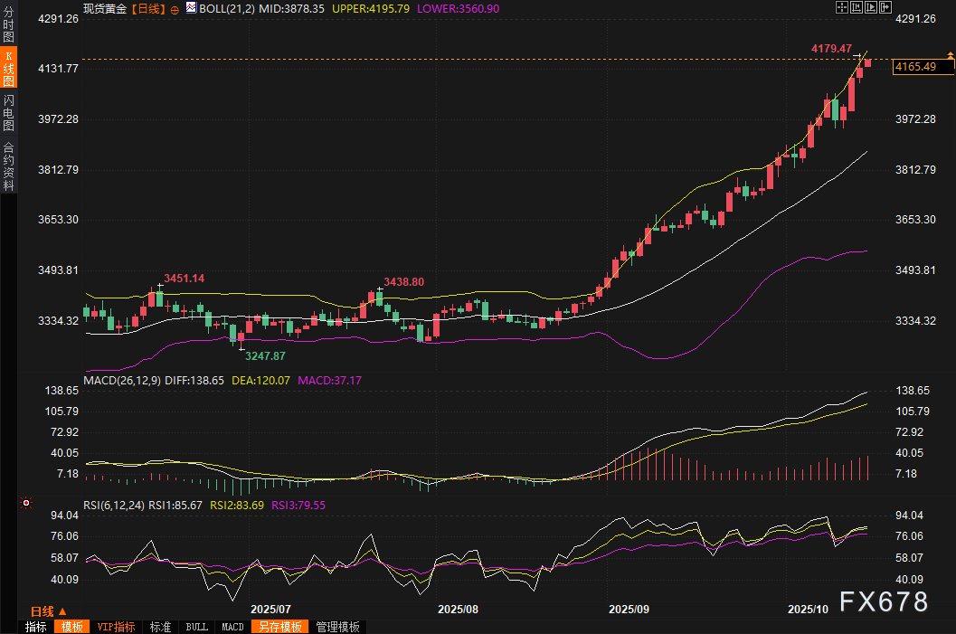 周三(10月15日)亚市早盘,现货黄金价格继续上攻,截止07:42,一度飙升逾20美元至4165.89美元/盎司,对国际贸易局势的担忧情绪再度升温,给金价提供上涨动能。周三金价一度刷新历史高点至4179.47美元/盎司,尽管盘中一度回调至4100关口下方,但逢低买盘很快帮助金价重拾涨势,收盘上涨0.77%,收报4142.01美元/盎司,国际贸易担忧、美国政府停摆、地缘政治风暴与货币政策转向有望帮助金价进一步冲高,机构目标已经看向5000关口上方。今年以来,黄金涨幅已高达57%,从年初的低谷到如今的巅峰,它见证了贸易战的硝烟、央行储备的狂热,以及美联储那隐隐传来的“鸽鸣”。