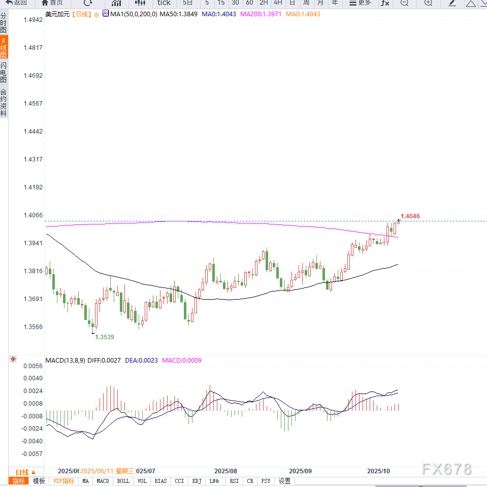 这使得加元在近期商品价格波动中表现相对稳健,为美元兑加元的进一步上行带来一定阻力。蒙特利尔银行(BMO)经济学家James Peterson表示:“加拿大劳动力市场的韧性为加元提供了短期支撑,但若油价持续走弱,加元仍可能承压。”日线图形结构来看,美元兑加元自9月初突破1.3800后一路上扬,目前价格运行于20日与50日均线之上,显示中期趋势依旧偏强。