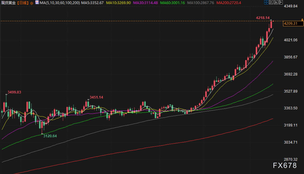 现货金周三触及4218.14美元, 12月份交割的美国期金结算价上涨0.9%,至4201.60美元。