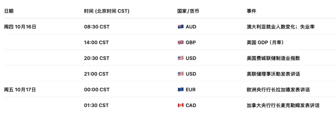 10月16日周四,新西兰在基本面上暂无重要数据和事件公布。需要关注的是,美国将于今日北京时间晚上20点30分发布费城联储制造业指数,以及21点美联储理事沃勒即将发表的讲话将成为市场关注焦点。