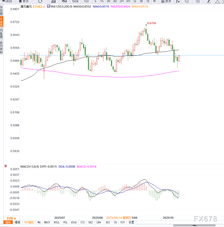 技术图形显示,澳元兑美元仍运行于下降通道中,整体趋势偏空。14日RSI位于50以下,表明市场情绪仍然谨慎。短线支撑位在0.6450附近,若跌破该位,可能测试8月低点0.6414与5月低点0.6372。