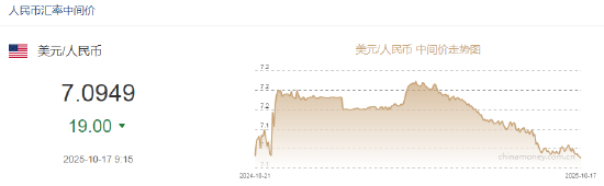 10月17日,人民币兑美元中间价报7.0949,上调19点。