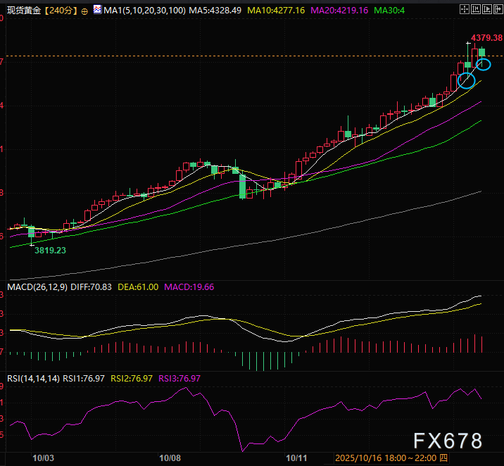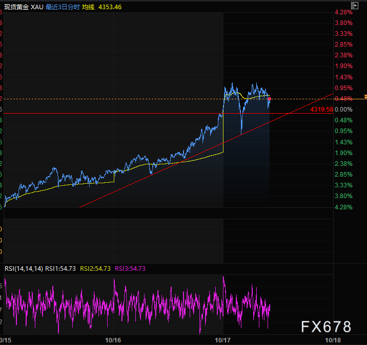 周五(10月17日),亚欧时段,现货黄金走出探底回升V型反转的走势,盘中一波下跌2%,约100美金,之后快速收复失地,目前交投于4333附近,上个交易日的周四黄金则加速上涨了130个点涨幅2.8%。同一时段现货白银也走出了探底回升的走势,盘中一度跌约100美分之后收复全部失地,周四白银上涨了2.1%。