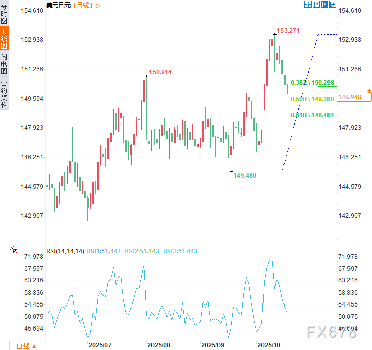 美元兑日元连续四个交易日下跌,并于周五(10月17日)亚市一度触及近两周低点(149.90),跌幅约0.30%。贸易关系再现紧张迹象,加之持续的地缘政治不确定性,抑制了投资者对风险资产的偏好,并推动部分避险资金流向日元。此外,对日本财政健康担忧的缓解,也是推动过去一周左右日元走强的因素。