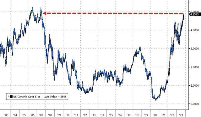 五年期美债收益率到美股尾盘升破4.89%,创2007年7月以来新高。