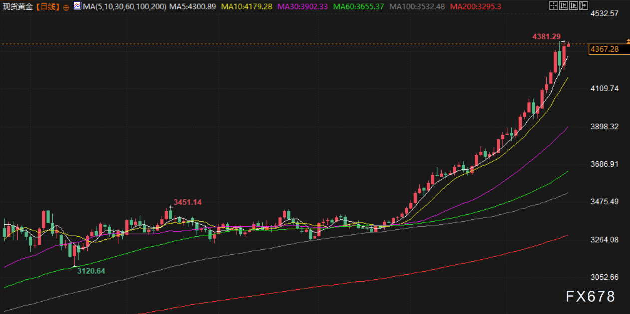 现货金再度刷新历史高位至每盎司4381.29美元。美国12月期金收涨3.5%,报每盎司4359.40美元。