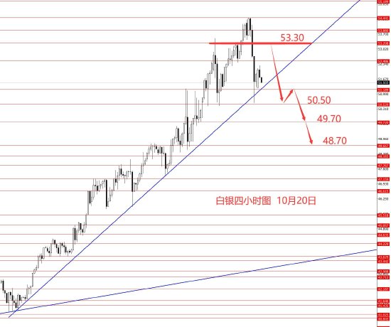 白银上周继续向上创新高,破了历史以来前高49.70,最高54.40区域。从图形来看,白银9月18日以来的上涨波幅接近尾声,本周留意高位震荡或震荡向下回调的修整行情。保守者可灵活应对高空低多,激进者建议逢高做空为主,激进者操作策略:53.30附近做空,止损54.50,目标看向50.50和49.70和48.70.按震荡向下格局操作,控制好止损金额,切记严格止损。