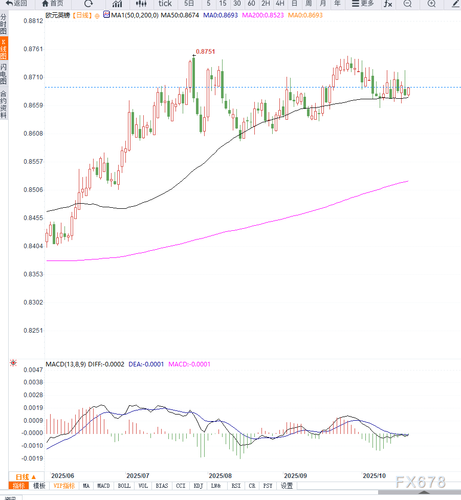反映多头动能平稳但未过热上方阻力关注 0.8720(近期高点)与 0.8760(通道上轨)下方关键支撑位于 0.8645(20日均线),进一步守位支撑看 0.8600日线偏多趋势未被破坏,若企稳 0.8645 之上,多头将继续保持主导
