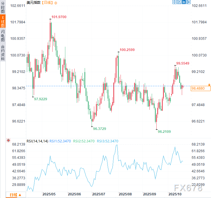 此次“不要国王”全国性抗议活动,从政治层面看,对美元构成了显著的利空压力。它主要通过侵蚀美元的底层信用根基——即市场对美国政治稳定性和制度韧性的信心,来施压美元。这不是普通的政策分歧,而是针对“威权倾向”和“民主常规颠覆”的全国性、大规模抗议。这直接触及了美国政治体系的核心稳定问题。美元的全球储备货币地位和避险属性,深深植根于全球对美国稳定的政治制度、法治环境和权力和平移交的信任。此类事件严重动摇这一信任基础。国际投资者会要求更高的风险补偿才愿意持有美元资产,导致资本外流,打压美元汇率。抗议活动“挑战特朗普主导的政策议程”。这表明未来的财政、贸易和监管政策将面临巨大的政治阻力和社会压力,政府推动经济立法的能力可能陷入瘫痪。市场厌恶不确定性,政策前景的模糊和潜在的政治僵局,会削弱美元资产的长期吸引力。外国直接投资和证券投资都可能因此变得谨慎,不利于美元的资本账户流入。数百万人的参与显示了社会内部的严重对立。这种深层次的社会撕裂会破坏商业和消费信心,从长远来看可能损害美国的生产率和经济增长潜力。货币强弱最终反映的是经济基本面。如果市场预期此类政治动荡将拖累美国未来的经济增长,美元将失去其最重要的支撑之一。周一(10月20日)美元指数动能不足,于98.50附近窄幅震荡,近六周来美元指数始终位于100关口下方低位震荡。