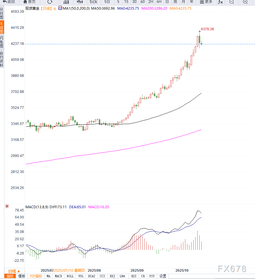 黄金在高位小幅回升,延续了上周五创纪录高点后的盘整走势。尽管价格在短线出现回落,但多重避险因素仍为黄金提供支撑,使其在4245美元附近维持韧性。