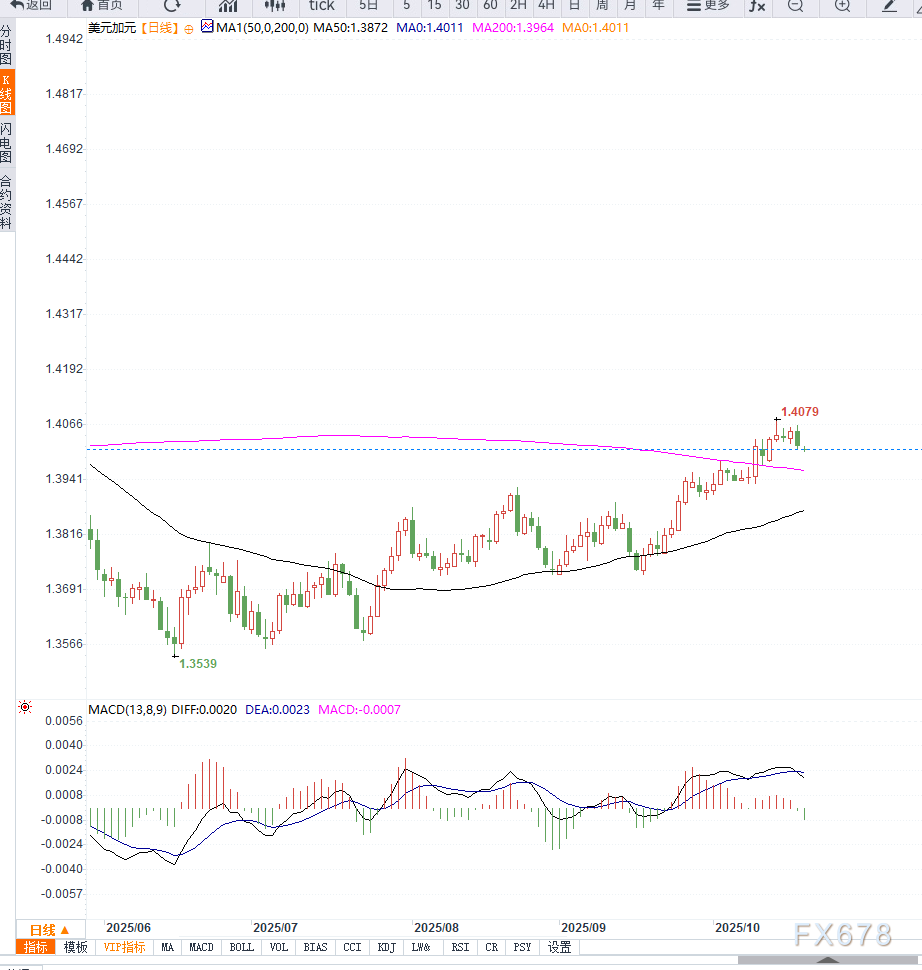 日线图显示,USD/CAD 在 1.4050–1.4070区间遇到阻力,多次未能突破,短线存在回调压力。下方支撑位集中在1.4000心理关口及1.3960–1.3950区域。
