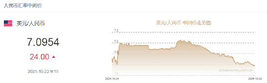 10月22日,人民币兑美元中间价报7.0954,下调24点。