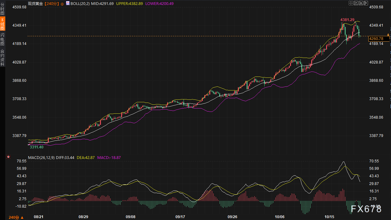 与之形成鲜明对比的是黄金的240分钟图,其日内2.23%的跌幅并非孤立事件,而是多重因素合力下的释放。价格报4259.17美元/盎司,已从前高4300附近回落,接近前低4218的支撑区间。布林带中轨4291.62正成为上方掣肘,当前价位跌破此线,暗示空头主导的延续性。上轨4382.92遥不可及,下轨4200.39则隐现为潜在底线,若失守可能引发更深回调。MACD指标DIFF为33.36,DEA为42.95,二线均在零轴上方,但DIFF的向下放量显示多头动能衰竭,柱状图收缩幅度加大,预示短期振荡加剧。黄金的这一急跌,部分源于政府停摆对避险需求的短期抑制:停摆虽放大不确定性,但延迟的经济数据反而缓和了即时恐慌情绪,交易者转而押注联储的鸽派路径将压制金价的保值溢价。此外,美元反弹的联动效应不可忽视——指数走高往往挤压非美资产的空间,尤其在通胀预期温和回升的语境下。