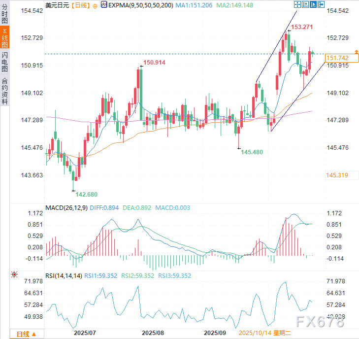 下行方面,短期支撑位出现在9日指数移动平均线(EMA)151.20附近。若跌破该水平将削弱短期上涨动能,推动美元/日元下探上升通道下轨150.00附近,继而考验50日指数移动平均线149.15支撑。持续走低将引发看跌转向,使汇价承压测试月度低点146.59附近的支撑位。