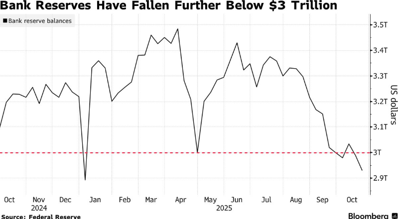 美国银行体系的准备金水平是美联储决定是否继续缩减资产负债表的关键因素。根据周四发布的美联储数据,截至10月22日当周,银行准备金下降约590亿美元至2.93万亿美元,创下自1月1日当周以来最低水平。