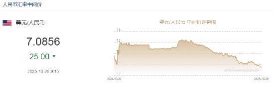 10月28日,人民币兑美元中间价报7.0856,上调25点。升值至2024年10月15日以来最高。