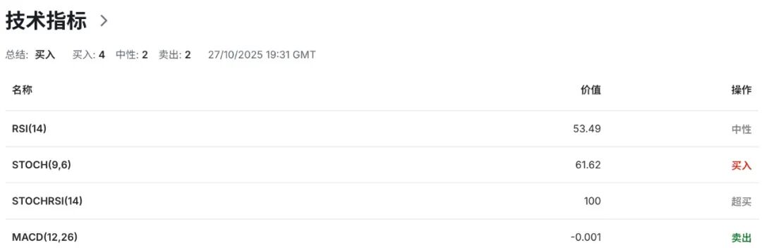 从日线技术指标分析,澳币兑美元汇率于昨日重新站上布林带中轨,进入相对强势区间,反映短期买盘动能有所增强。布林带整体开口维持扩张态势,显示市场波动率继续走高,若此形态持续,有望进一步强化趋势性上行动能。目前布林带上轨位于0.6640区域,构成短期动态阻力;下轨动态支撑指向0.6440水平;中轨0.6540则成为判断多空力量转换的关键枢轴位。14日相对强弱指标(RSI)当前读数为53,虽仍处于45-55的均衡区间,但若买盘动能持续增强,有望突破当前平衡状态,为上行打开更多技术空间。
