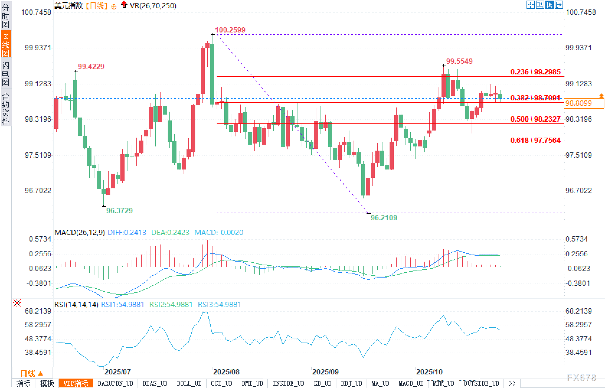 MACD中枢上移但DIF略低于DEA,柱体转弱,动能趋缓;RSI(14)徘徊55附近,中性偏强但未形成趋势放大。若0.382回撤维持有效,区间结构大概率延续;若失守,下一观察点在0.500 98.2327及0.618 97.7564;向上则需收盘重返99.30上方并伴随动能扩张,方可评估对99.55的再测试。整体仍以震荡等待信号为主。