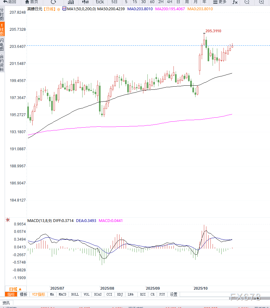 在日本财政预期偏宽松但货币政策迟滞的背景下,日元难以获得明确支撑,而英国经济数据短期仍有利于英镑。若日本央行本周仍缺乏实质性的紧缩信号,则GBP/JPY仍存在进一步走高空间。但需警惕事件风险与短线回踩压力。