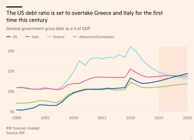 IMF数据显示,至少自本世纪初以来,美国一般政府总债务一直低于意大利和希腊的水平。这一指标是衡量债务水平的广义指标,涵盖了中央和地方政府的债务。