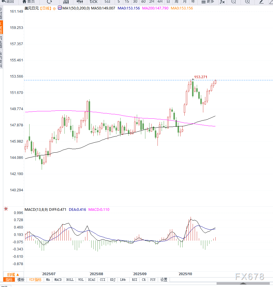 从技术面来看,USD/JPY若突破153.25–153.30美元阻力位,将触发新一轮多头买盘,可能进一步上攻至154.00美元关口,随后目标关注154.75–154.80美元及155.00心理位。