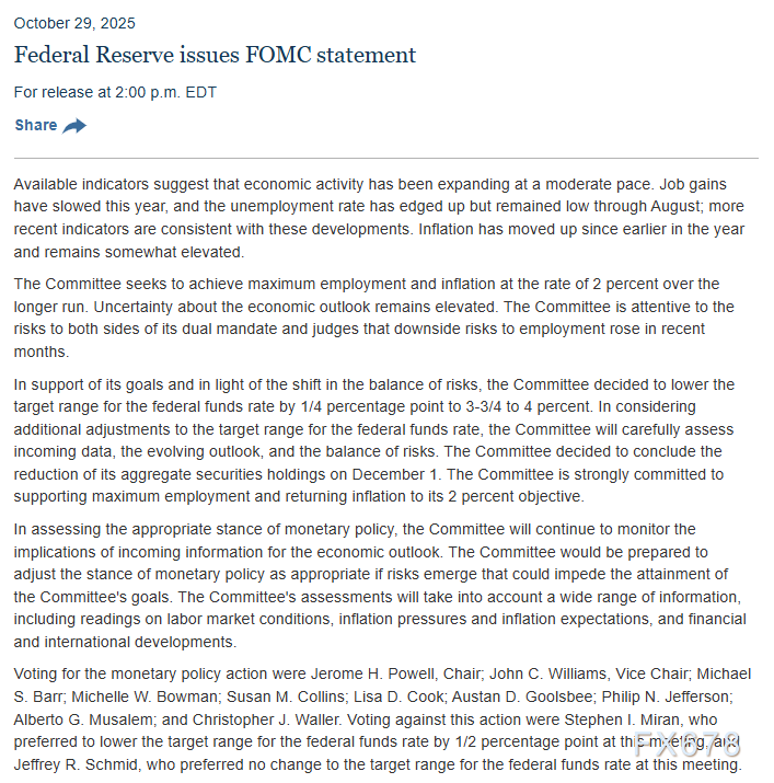 美联储周三(10月29日)在意见分歧的情况下将利率下调25个基点,并表示将有限重启美债购买计划。以下为美国联邦储备委员会(美联储/FED)的联邦公开市场委员会(FOMC)在10月28日-29日货币政策会议后发布的声明全文: