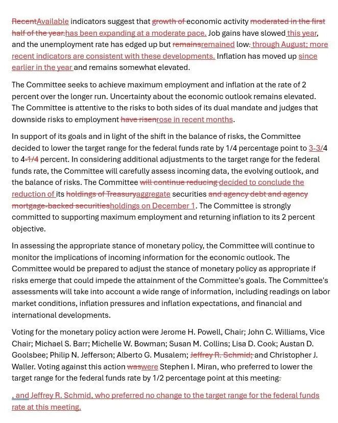 声明重申“鉴于风险平衡已转变”决定降息,将“最近的”数据指标换为“可获得的”,新增指出,劳动力市场近期指标与政府关门前趋势相符,称就业下行风险“近几个月增加”。