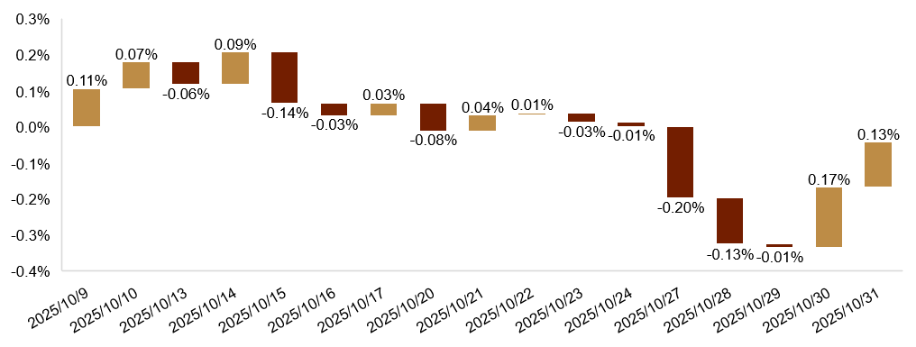 中美双方经贸团队于吉隆坡完成会谈,我们认为对人民币汇率的影响偏向积极。具体来看,10月的中美经贸关系一度经历波折。中国商务部在10月9日公布[6]相关出口管制,特朗普表示[7],将从11月1日起对中国额外加征100%的关税,并对美国关键制造软件实施出口管制。不过随后中美推进局势降温,双方10月25日至26日在马来西亚吉隆坡举行经贸磋商[8],围绕美对华海事物流和造船业301措施、延长对等关税暂停期、芬太尼关税和执法合作、农产品贸易、出口管制等双方共同关心的重要经贸问题展开磋商。10月30日,两国元首在釜山举行会晤[9]。商务部于当日下午表示[10],中美经贸团队通过吉隆坡磋商,达成了美国降低10%的“芬太尼关税”、继续暂停“对等关税”以及双方暂停部分出口管制等成果共识。