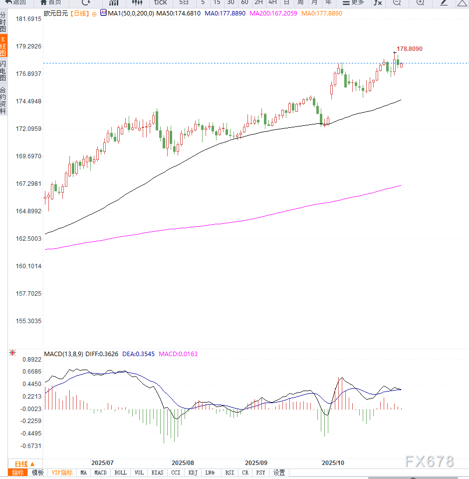 从技术面来看,EUR/JPY日线显示汇价自10月中旬高点回落后,短期在176.80至178.20区间震荡。汇价目前略高于20日移动均线,但动能指标显示上行动能有限。