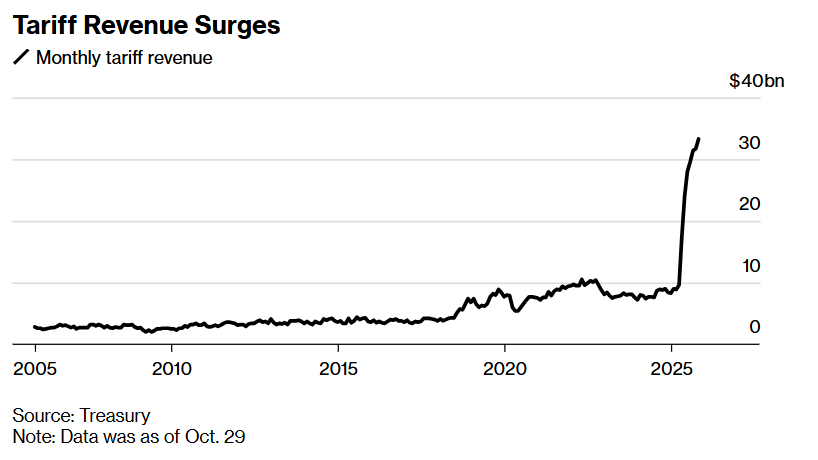 准确来说,逆风情绪并未完全消散。即便关税收入每月大约300亿美元,美国政府的年度融资需求仍超过1.5万亿美元。还存在关税政策被美国最高法院推翻的风险,最高法院将于11月5日就其合法性进行辩论。