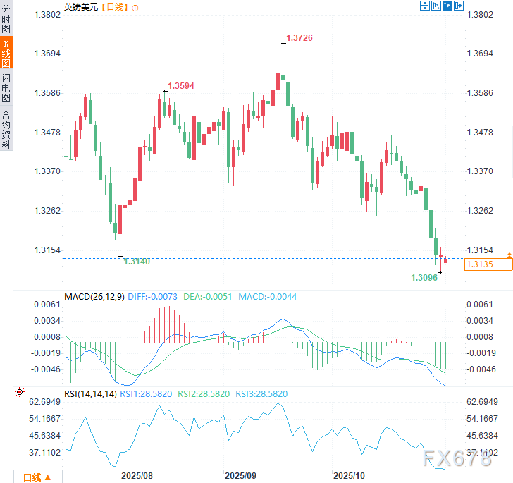“贸易摩擦”和“美国政府停摆”会影响全球风险情绪。若风险厌恶情绪升温,资金会涌向美元避险,同样利空英镑兑美元。交易者将密切关注英国央行本次会议的政策指引,并将其作为判断12月乃至明年利率路径的关键依据。在预算案和数据明朗之前,英镑很难走出明确的单边趋势,可能维持震荡格局。周一英镑兑美元维持窄幅震荡,前一交易日该货币对一度创下4月14日以来新低点(1.3096)。