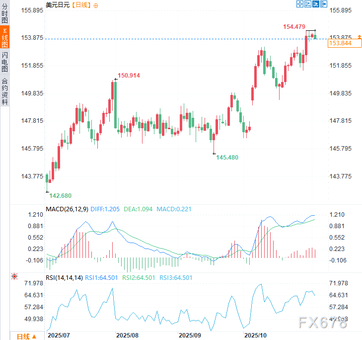 (美元兑日元日线图,来源:易汇通)北京时间13:45,美元兑日元交投于153.75/76。