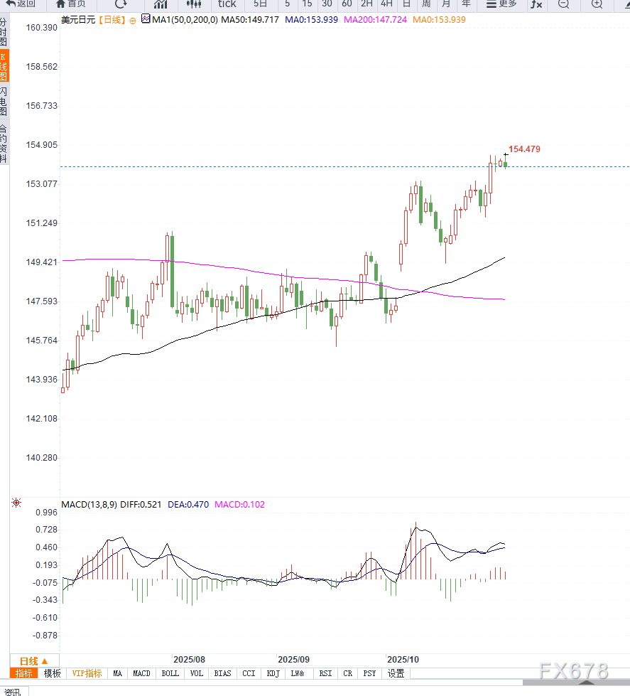 技术上美元兑日元短线仍处于上行趋势中,若未出现政府干预或突发风险事件,汇价有望继续在154–155区间震荡偏强运行。长期来看,若日本央行在年底前采取行动,市场情绪或将迎来短暂反转,但在政策分化持续的背景下,美元的强势地位仍难撼动。
